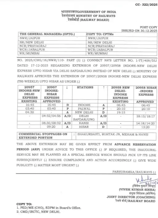 इंदौर से दिल्ली के बीच चलने वाली इंदौर–दिल्ली त्रि-साप्ताहिक एक्सप्रेस (20957/58) अब रोहतक-महम होते हुए हिसार तक चलेगी। रेलवे बोर्ड ने इस रूट विस्तार को मंजूरी दे दी है। इससे हरियाणा के हिसार, रोहतक और महम क्षेत्र के यात्रियों को बड़ी राहत मिलेगी, क्योंकि पहले इन शहरों से इंदौर के लिए कोई सीधी रेल सुविधा उपलब्ध नहीं थी।