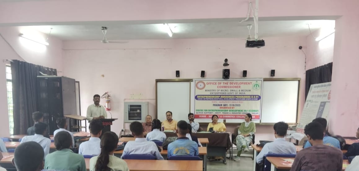 सागर: एमएसएमई एवं सेडमैप सागर के संयुक्त तत्वाधान में पंडित दीनदयाल उपाध्याय शासकीय कला एवं वाणिज्य महाविद्यालय सागर में 17 अक्टूबर 2025 को एक दिवसीय उद्यमिता जागरूकता कार्यक्रम का आयोजन किया गया। कार्यक्रम की मुख्य आतिथ्य महाविद्यालय की प्राचार्य डॉ. सरोज गुप्ता ने की।