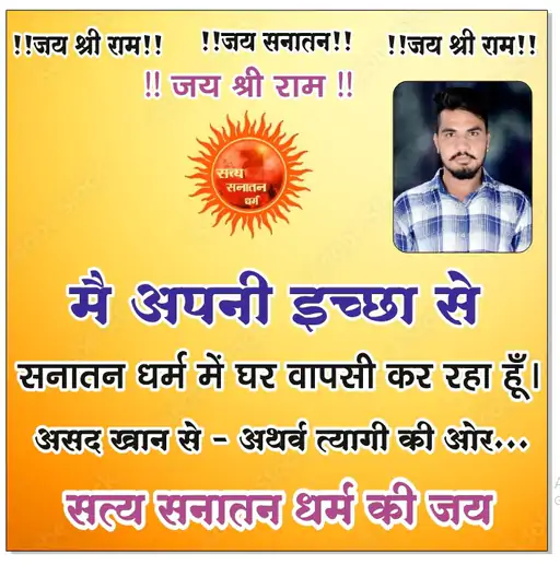वाराणसी में मध्य प्रदेश के सागर जिले के रहने वाले असद खान ने सनातन धर्म में विधिवत घर वापसी कर ली। काशी की पावन धरती पर गंगा नदी में नाव पर 21 वैदिक ब्राह्मणों की उपस्थिति में शुद्धिकरण, पूजन और नामकरण संस्कार संपन्न कराया गया। वैदिक विधि-विधान से हुए इस धार्मिक अनुष्ठान के बाद असद खान का नया नाम ‘अथर्व त्यागी’ रखा गया।