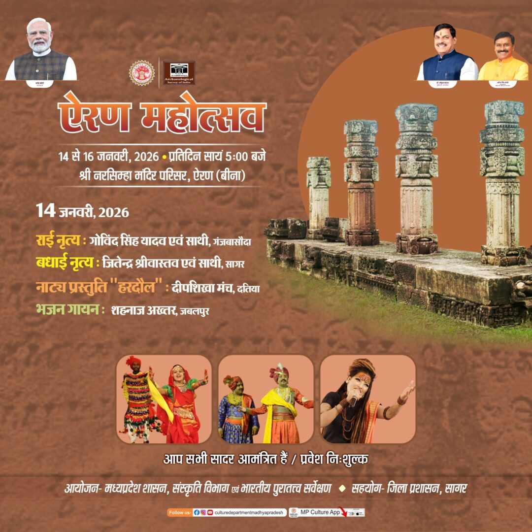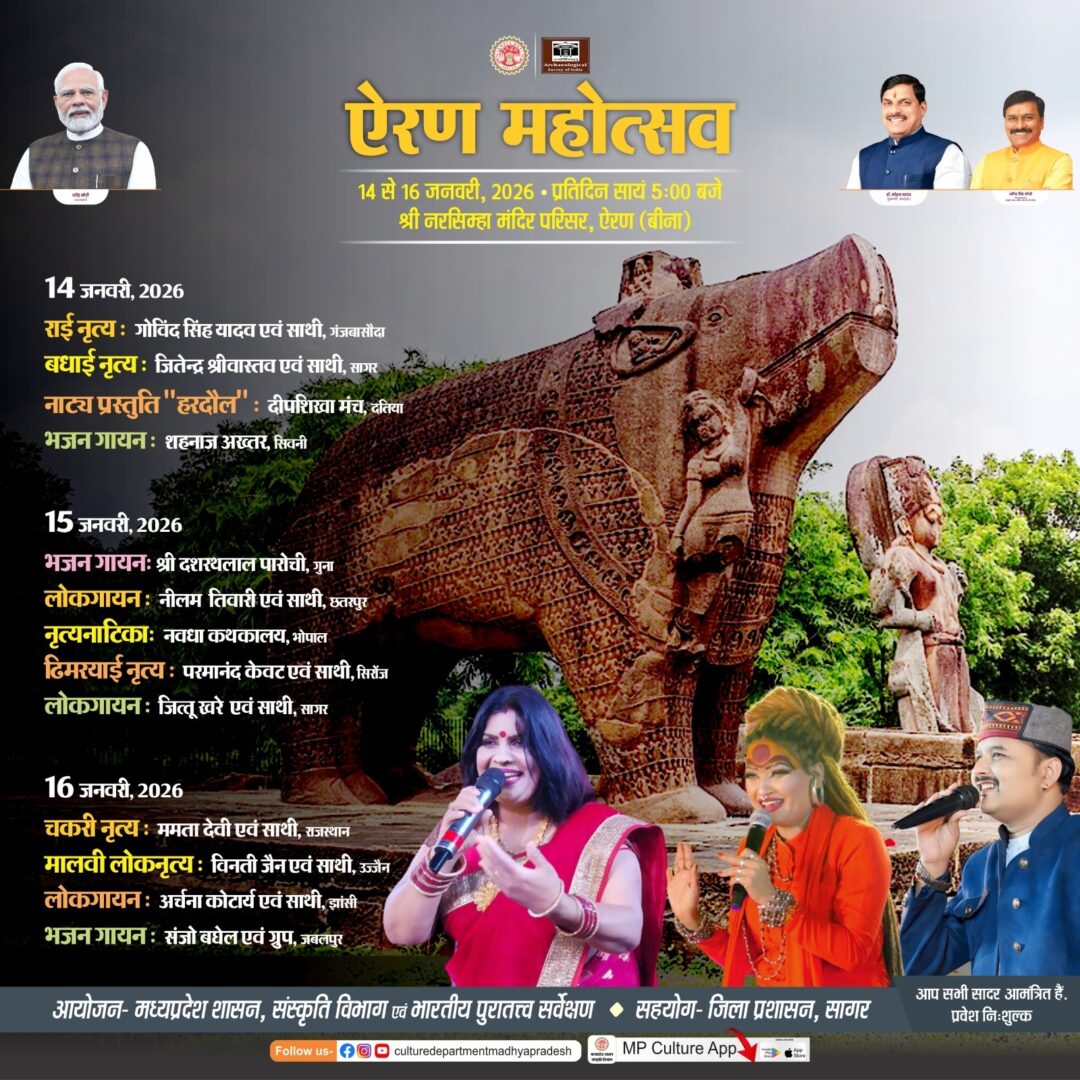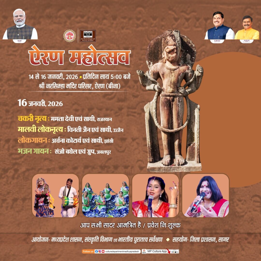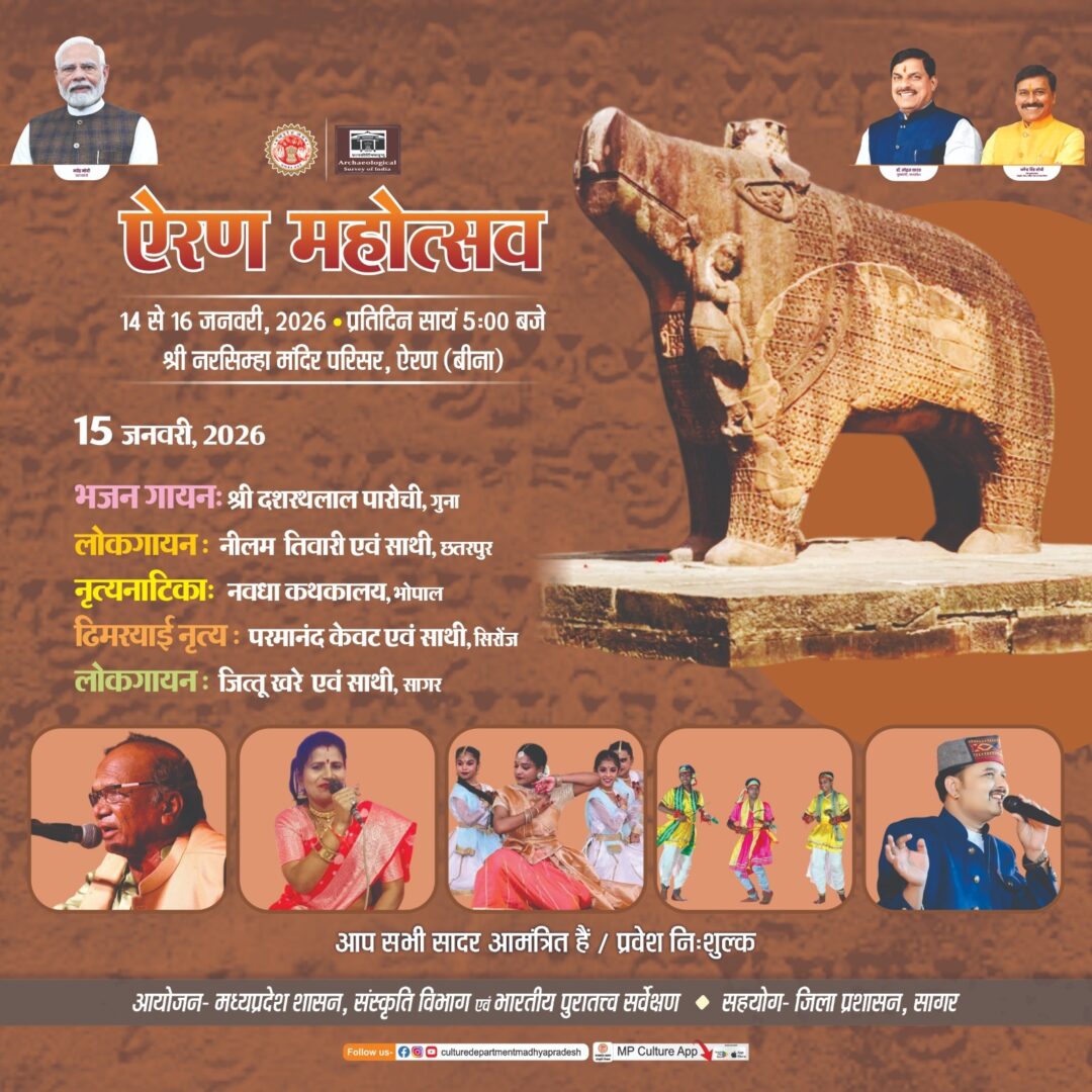 सागर। मध्यप्रदेश शासन के संस्कृति विभाग एवं भारतीय पुरातत्व सर्वेक्षण द्वारा, जिला प्रशासन सागर के सहयोग से, बुंदेलखंड की ऐतिहासिक धरोहर ऐरण (बीना) में स्थित श्री नरसिंहा मंदिर परिसर में “ऐरण महोत्सव” का भव्य आयोजन 14 से 16 जनवरी 2026 तक किया जा रहा है।