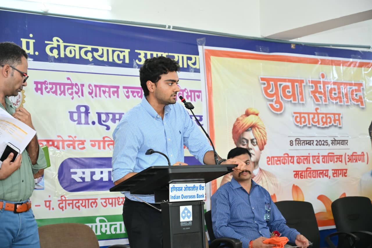 सागर, 08 सितंबर 2025 – भाजपा युवा नेता श्री अविराज सिंह ने शासकीय पीएम महाविद्यालय मकरोनिया एवं शासकीय कला एवं वाणिज्य (अग्रणी) महाविद्यालय, सागर में आयोजित युवा संवाद कार्यक्रम को संबोधित किया। इस अवसर पर उन्होंने युवाओं से आग्रह किया कि वे आत्मनिर्भर बनें और देश के विकास में सक्रिय भागीदारी निभाएं।