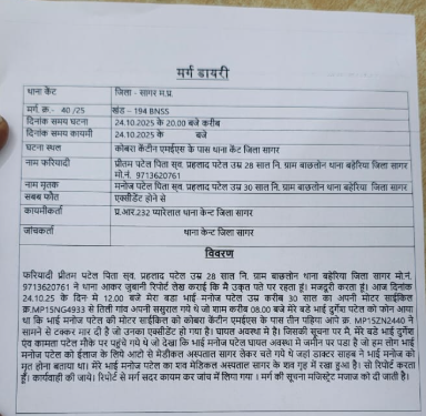 पुलिस से मिली जानकारी के अनुसार, फरियादी प्रीतम पटेल, निवासी ग्राम बाछलोन, ने थाने में रिपोर्ट दर्ज कराई कि उसका बड़ा भाई मनोज पटेल (30 वर्ष) शुक्रवार दोपहर अपनी मोटरसाइकिल एमपी 15 एनजी 4933 से अपनी ससुराल तिली गए थे। रात करीब 8 बजे जब वे लौट रहे थे, तभी कोबरा कैंटीन ईएमएस के पास सामने से आ रहे तीन पहिया आपे वाहन (एमपी 15 जेडएन 2440) ने उनकी बाइक को जोरदार टक्कर मार दी।