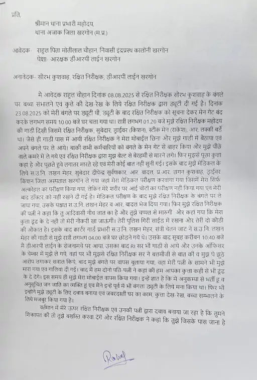 पीड़ित कॉन्स्टेबल राहुल चौहान ने अपनी शिकायत में बताया कि उसकी ड्यूटी 23 अगस्त को आरआई कुशवाहा के सरकारी आवास पर लगी थी। रात करीब 10 बजे जब आरआई ड्यूटी पूरी कर घर लौट आए तो वह अपने क्वार्टर चला गया। लेकिन उसी रात करीब 1:30 बजे आरआई ने फोन कर तुरंत घर बुलाया।