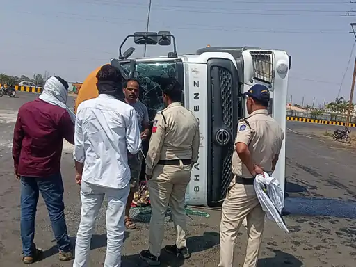 खुरई में बड़ा हादसा टला: 70 क्विंटल सीमेंट-राखड़ से भरा कंटेनर पलटा, 5 टायर फटने से बिगड़ा संतुलन, एक घायल !