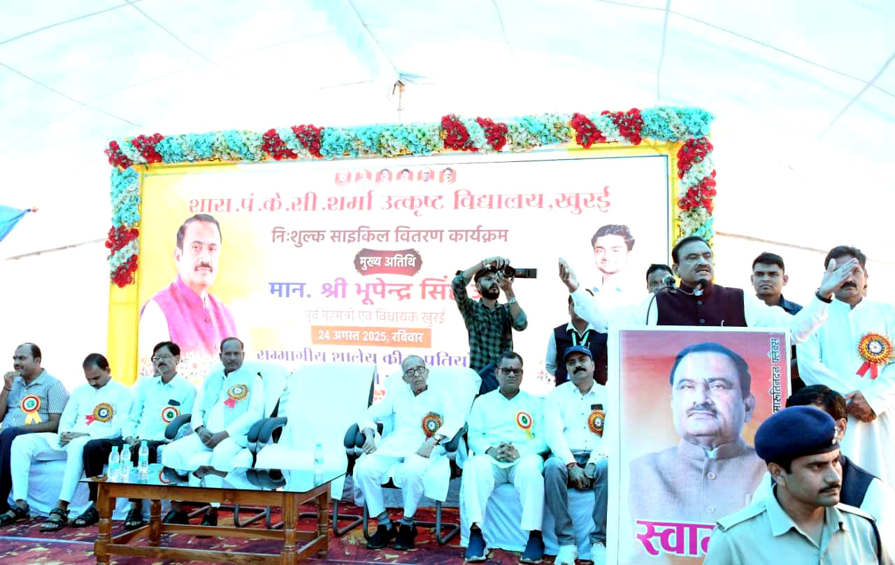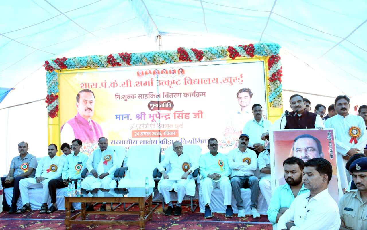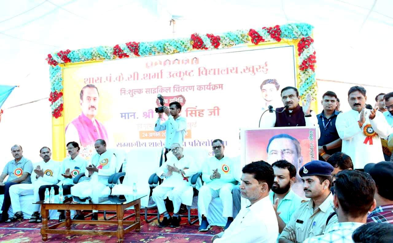 खुरई। शिक्षा और विकास को लेकर खुरई लगातार प्रदेश और देश में नई मिसाल कायम कर रहा है। इसी कड़ी में पं. केसी शर्मा उत्कृष्ट विद्यालय खुरई में आयोजित निःशुल्क साइकिल वितरण कार्यक्रम में पूर्व गृहमंत्री एवं वरिष्ठ विधायक श्री भूपेन्द्र सिंह ने विद्यार्थियों को संबोधित करते हुए कहा कि खुरई विधानसभा क्षेत्र का शैक्षिक वातावरण इस तरह बनाया गया है कि यहां के बच्चे आने वाले समय में देश ही नहीं बल्कि दुनिया में भी अपना नाम रोशन करें।