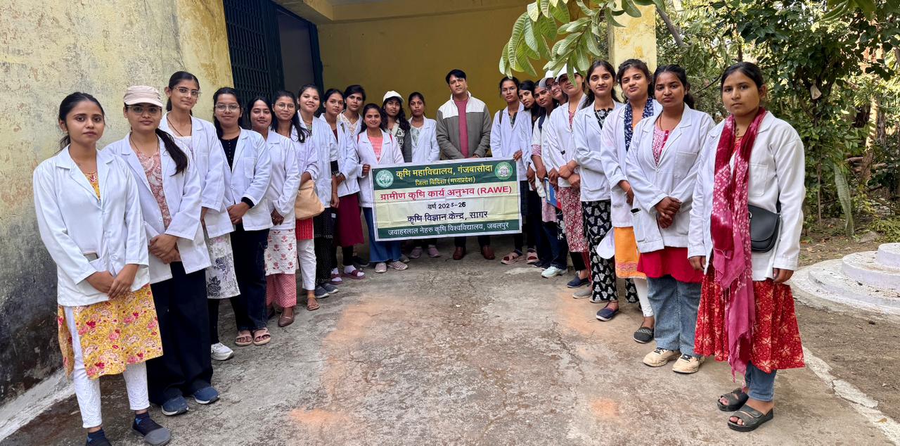 जवाहरलाल नेहरू कृषि विश्वविद्यालय (जएनकेवीवी) से संबद्ध कृषि महाविद्यालय गंजबासौदा की RAWE (Rural Agricultural Work Experience) कार्यक्रम अंतर्गत 23 छात्राओं ने कृषि विज्ञान केंद्र (KVK) सागर में विभिन्न कृषि प्रयोगशालाओं का शैक्षणिक भ्रमण किया। यह भ्रमण वरिष्ठ वैज्ञानिक एवं प्रमुख डॉ. के.एस. यादव के मार्गदर्शन तथा RAWE इंचार्ज डॉ. ममता सिंह की उपस्थिति में संपन्न हुआ।