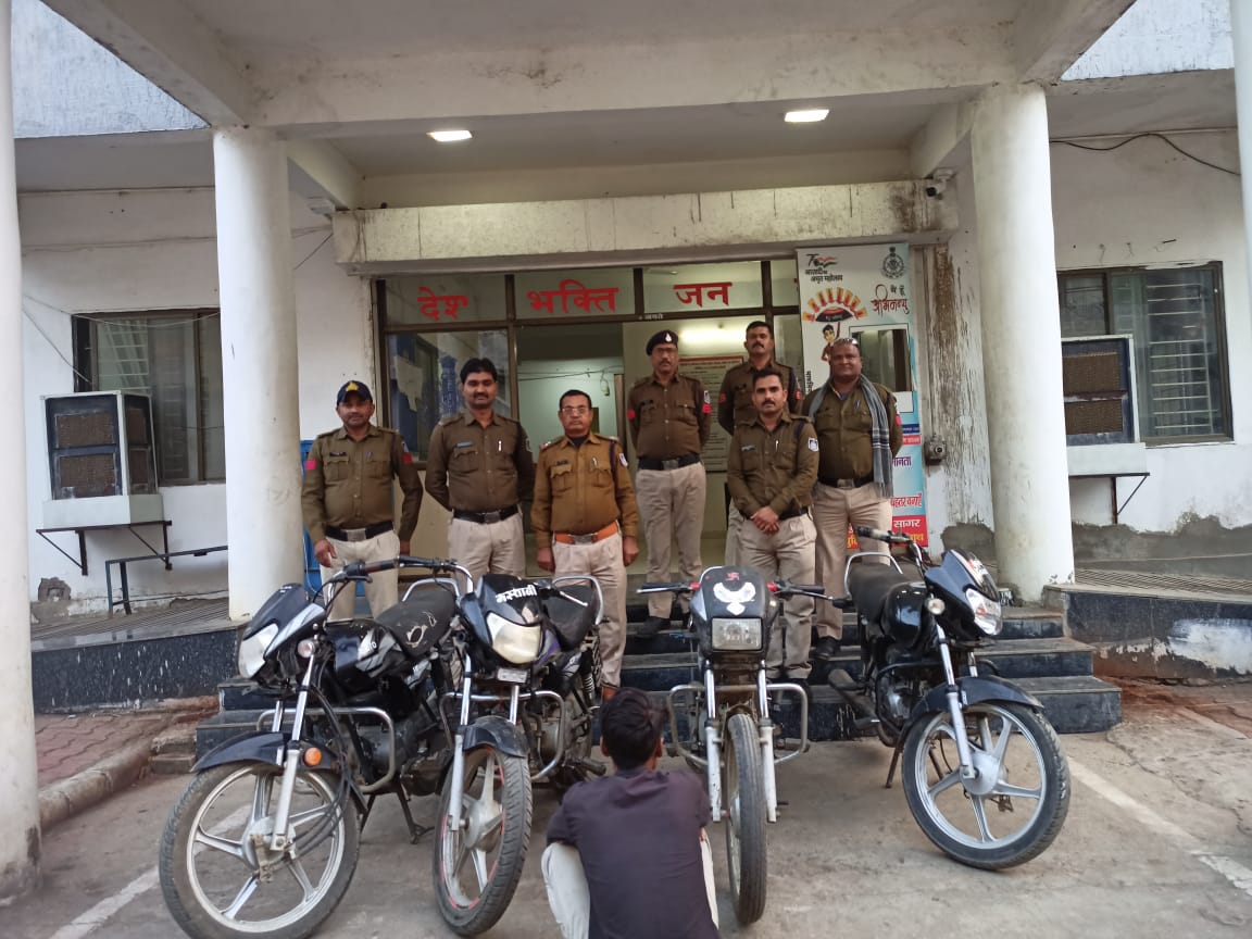 जिला सागर में वाहन चोरी की घटनाओं पर रोक लगाने हेतु चलाए जा रहे विशेष अभियान के तहत थाना खुरई पुलिस ने एक महत्वपूर्ण सफलता हासिल की है। पुलिस ने अलग-अलग स्थानों से चोरी हुई कुल 04 मोटर साइकिलें बरामद कर तीन आरोपियों को पकड़ने में सफलता प्राप्त की है।