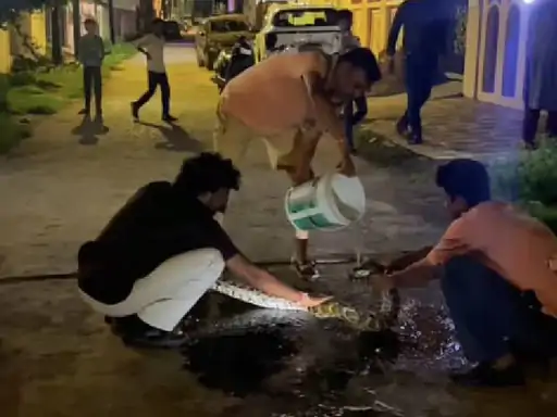 इसी बीच, बुधवार देर रात जबलपुर के शक्ति नगर इलाके में करीब 8 फीट लंबा और 40 किलो वजनी अजगर दिखाई दिया। कॉलोनीवासियों ने इसकी सूचना वन्यजीव विशेषज्ञ अवि बरसे को दी। उनकी टीम ने मौके पर पहुंचकर अजगर को पकड़ा, पानी पिलाया और सुरक्षित रूप से वन विभाग को सौंप दिया।