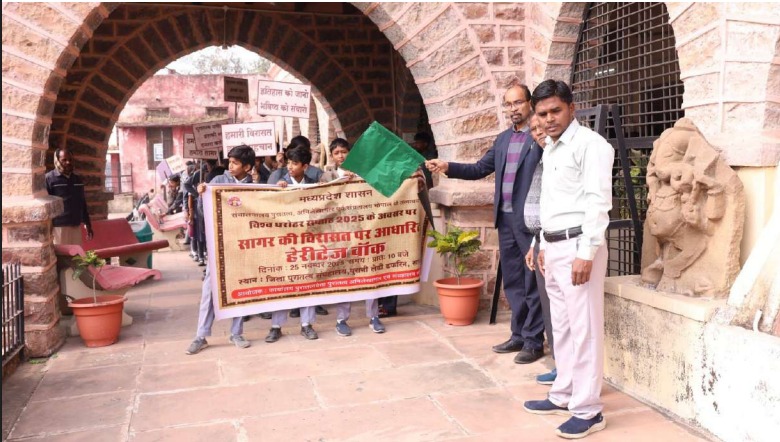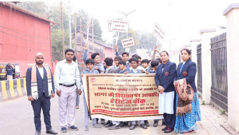 संचालनालय पुरातत्व अभिलेखागार एवं संग्रहालय, भोपाल के निर्देशानुसार आज विश्व धरोहर सप्ताह 2025 के अवसर पर जिला पुरातत्व संग्रहालय (पुरानी लेडी डफरिन हॉस्पिटल परिसर) में हमारी विरासत पर आधारित हेरीटेज वॉक का आयोजन किया गया। कार्यक्रम का उद्देश्य बच्चों में स्थानीय ऐतिहासिक और पुरातात्विक धरोहरों के प्रति जागरूकता बढ़ाना तथा संरक्षण के प्रति उत्तरदायित्व व्यक्त करना था।