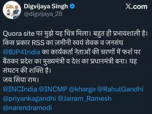 इसके बाद दिग्विजय सिंह ने सोशल मीडिया प्लेटफॉर्म एक्स (पूर्व ट्विटर) पर एक फोटो साझा की। फोटो के साथ उन्होंने लिखा कि संगठन की शक्ति के कारण ही कोई व्यक्ति पूर्व उप प्रधानमंत्री और बीजेपी के पूर्व राष्ट्रीय अध्यक्ष लालकृष्ण आडवाणी के चरणों में बैठने वाला कार्यकर्ता मुख्यमंत्री और प्रधानमंत्री बन सका। उन्होंने उदाहरण के तौर पर प्रधानमंत्री नरेंद्र मोदी का उल्लेख किया।