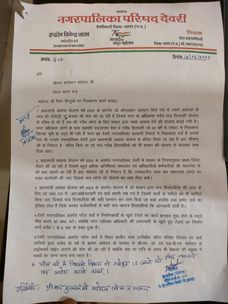 देवरी (सागर), 10 जून 2025: देवरी नगरपालिका में प्रधानमंत्री आवास योजना (पीएमएवाई) में अनियमितताओं और भ्रष्टाचार के आरोपों को लेकर कांग्रेस पार्षद त्रिवेंद्र जाट के नेतृत्व में सैकड़ों नागरिकों ने मंगलवार को एसडीएम कार्यालय का घेराव किया। प्रदर्शनकारियों ने “भ्रष्टाचार बंद करो” के नारे लगाते हुए सागर कलेक्टर के नाम 6-सूत्रीय मांगों का ज्ञापन एसडीएम को सौंपा।