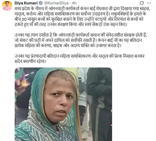 राजस्थान की डिप्टी सीएम दीया कुमारी ने कंचनबाई के बलिदान को महिला सशक्तिकरण और मातृत्व का सर्वोच्च उदाहरण बताते हुए नमन किया। उन्होंने कहा कि कंचनबाई ने बच्चों को सुरक्षित रखने के लिए सैकड़ों मधुमक्खियों के डंक सहन किए, और उनका यह त्याग हर महिला की करुणा, साहस और अदम्य शक्ति को उजागर करता है।