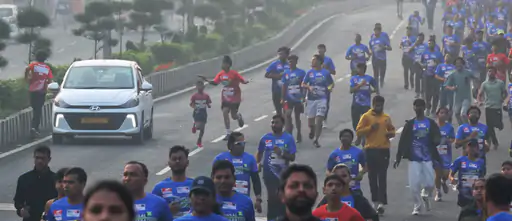 मौके से सामने आई तस्वीरों में स्पष्ट दिख रहा है कि धावकों के बीच एक सफेद कार आगे बढ़ती नजर आ रही है, जबकि पीछे सैकड़ों प्रतिभागी दौड़ रहे हैं।