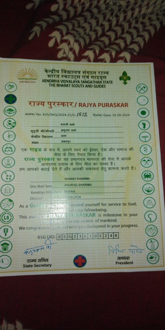 पीएमश्री केंद्रीय विद्यालय ढाना की छात्राओं शानवी शर्मा, गार्गी गर्ग और नम्रता चौरसिया ने भारत स्काउट एवं गाइड के क्षेत्र में उत्कृष्ट प्रदर्शन करते हुए राज्य स्तरीय पुरस्कार प्राप्त कर विद्यालय और जिले का नाम गौरवान्वित किया है। हाल ही में तीनों छात्राओं ने कटनी में आयोजित राज्य स्तरीय केम्प में भाग लिया, जहाँ इन्होंने विभिन्न कार्यक्रमों में अपनी प्रतिभा और नेतृत्व क्षमता का परिचय दिया। इनकी मेहनत और दक्षता के आधार पर इन्हें राज्य पुरस्कार से सम्मानित किया गया।
