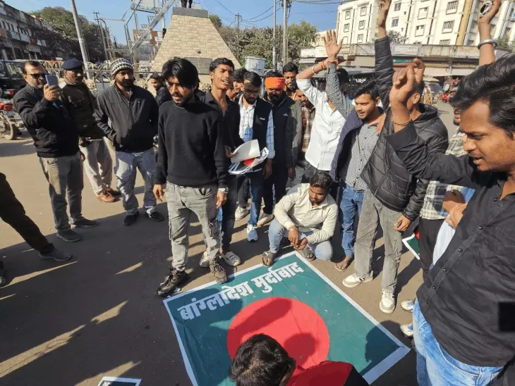 प्रदर्शनकारी जब छत्रसाल चौराहे पर पहुंचे, तो उन्होंने बीच सड़क पर बांग्लादेश के झंडे और विरोध से जुड़े बैनरों को कीलों से ठोककर जमीन पर लगाया। इसके बाद प्रतीकात्मक रूप से इन्हें पैरों तले रौंदा गया। कुछ प्रदर्शनकारियों ने अपने वाहनों से भी बैनरों को कुचलते हुए आक्रोश व्यक्त किया। इस दौरान “हिंदुओं पर अत्याचार बंद करो”, “दोषियों पर सख्त कार्रवाई हो” जैसे नारे गूंजते रहे।