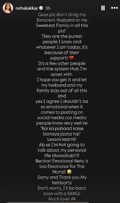 अपने पोस्ट के अंत में नेहा ने कहा कि वह अब अपनी पर्सनल लाइफ पर सार्वजनिक रूप से बात नहीं करेंगी। उन्होंने खुद को “बहुत ज्यादा इमोशनल नेहू” बताते हुए फैंस से माफी मांगी और भरोसा दिलाया कि वह जल्द ही धमाकेदार वापसी करेंगी। साथ ही उन्होंने अपने फैंस ‘नेहार्ट्स’ को धन्यवाद भी कहा।