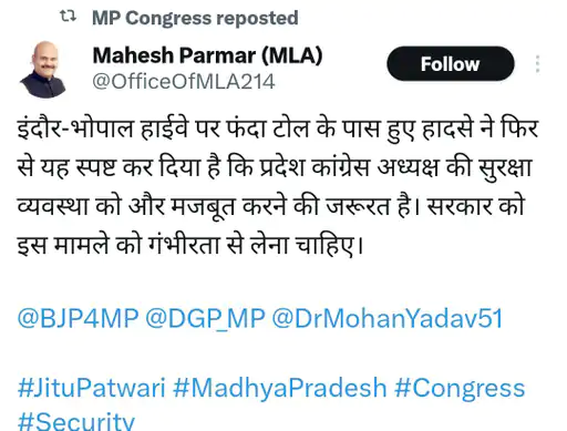“इंदौर-भोपाल हाईवे पर फंदा टोल के पास कांग्रेस प्रदेश अध्यक्ष श्री @jitupatwari जी के वाहन को ट्रक ने टक्कर मार दी! प्रदेश अध्यक्ष जी और उनका स्टाफ सुरक्षित है! मोहन सरकार लगातार श्री पटवारी जी की सुरक्षा को नजरअंदाज कर रही है! उनकी सुरक्षा से किया जा रहा खिलवाड़ अनुचित है! सरकार को तत्काल उचित सुरक्षा व्यवस्था और अन्य साधन प्रदान करने चाहिए।”