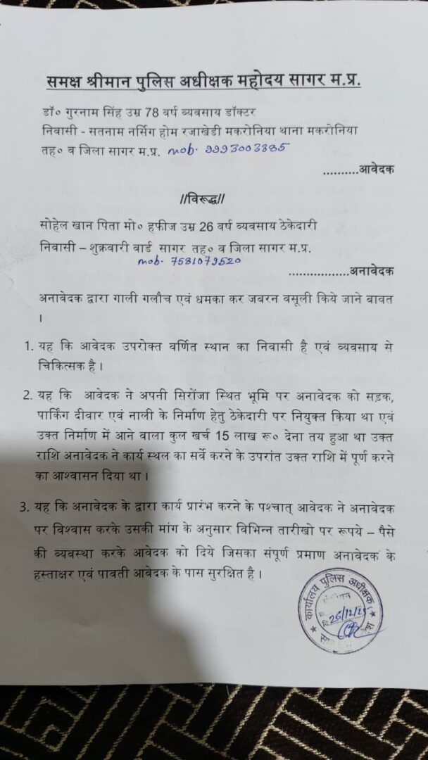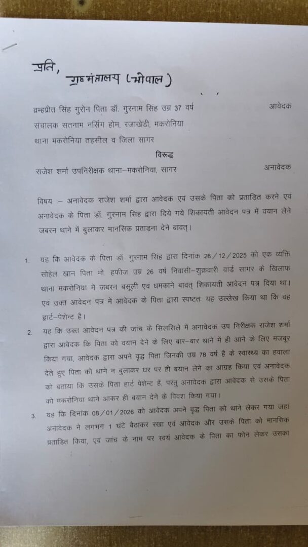 सागर जिले के मकरोनिया थाना क्षेत्र से पुलिस की कार्यप्रणाली पर सवाल खड़े करने वाला मामला सामने आया है। मकरोनिया निवासी मनी सिंह गुरोन ने थाना मकरोनिया में पदस्थ सब इंस्पेक्टर राजेश शर्मा पर अपने पिता डॉ. गुरनाम सिंह को मानसिक रूप से प्रताड़ित करने के गंभीर आरोप लगाए हैं। मनी सिंह ने इस संबंध में सागर पुलिस अधीक्षक को लिखित शिकायत सौंपते हुए न्याय की गुहार लगाई है। इसके साथ ही राष्ट्रीय एवं राज्य मानवाधिकार आयोग, पुलिस महानिदेशक और गृह मंत्रालय को भी शिकायत भेजी गई है।