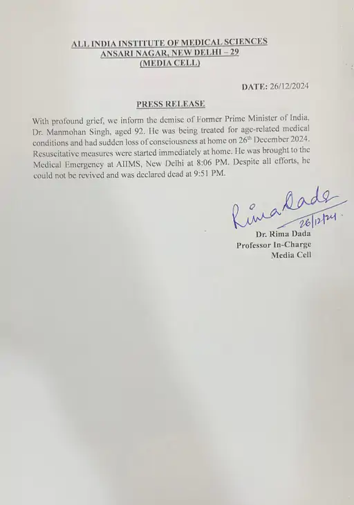 भारत के पूर्व प्रधानमंत्री डॉ. मनमोहन सिंह का निधन 92 साल की उम्र में हुआ। 26 दिसंबर 2024 की रात को उनकी तबियत अचानक बिगड़ी और उन्हें दिल्ली के अखिल भारतीय आयुर्विज्ञान संस्थान (AIIMS) में भर्ती कराया गया था। हालांकि, अस्पताल और उनके परिवार की तरफ से अभी तक उनकी मृत्यु की आधिकारिक पुष्टि नहीं की गई है, लेकिन कई प्रमुख नेताओं जैसे रॉबर्ट वाड्रा, पप्पू यादव, मनोज झा और सलमान खुर्शीद ने सोशल मीडिया प्लेटफॉर्म X (पूर्व में ट्विटर) पर उनके निधन पर शोक व्यक्त किया है।