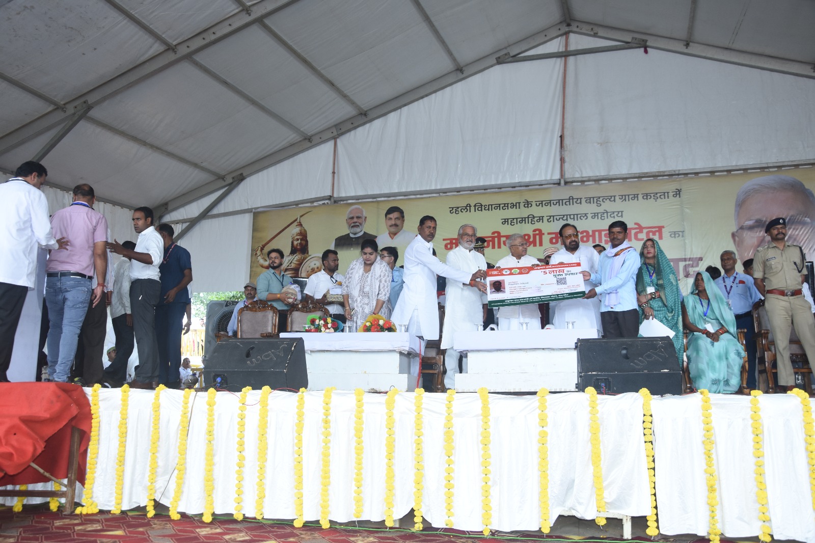 प्रदेश के राज्यपाल श्री मंगुभाई पटेल ने सागर जिले के ग्राम कड़ता में आयोजित कार्यक्रम के दौरान केंद्र एवं मध्यप्रदेश शासन की विभिन्न जनकल्याणकारी योजनाओं से लाभान्वित हितग्राहियों को प्रमाणपत्र और सहायता सामग्री वितरित की। इस अवसर पर उन्होंने कहा कि सरकार की योजनाओं का उद्देश्य समाज के अंतिम व्यक्ति तक विकास और सुविधा पहुंचाना है।