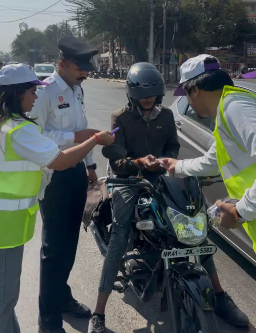 इंदौर: राष्ट्रीय सड़क सुरक्षा माह 2026 (1 से 31 जनवरी) के अंतर्गत इंदौर में सड़क सुरक्षा और यातायात नियमों के प्रति जनजागरूकता बढ़ाने के लिए लगातार कार्यक्रम आयोजित किए जा रहे हैं। इसी श्रृंखला में शनिवार को गीता भवन चौराहा पर यातायात पुलिस ने विशेष जागरूकता अभियान का आयोजन किया।
