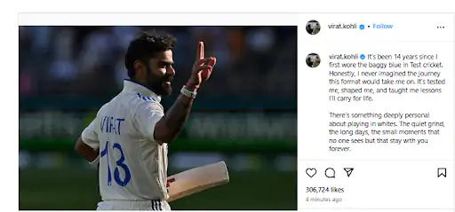 भारतीय क्रिकेट टीम के पूर्व कप्तान और दिग्गज बल्लेबाज विराट कोहली ने 10 जनवरी 2024 को टेस्ट क्रिकेट से संन्यास लेने की घोषणा कर दी। उन्होंने इंस्टाग्राम पर एक भावुक पोस्ट लिखकर इस फैसले की जानकारी दी और अपने टेस्ट करियर को याद किया।