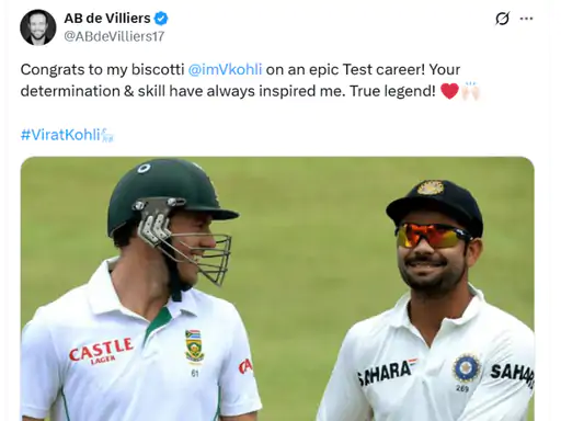 दक्षिण अफ्रीका के पूर्व कप्तान और कोहली के करीबी दोस्त एबी डी विलियर्स ने उन्हें “सच्चा लीजेंड” बताया। उन्होंने कहा—