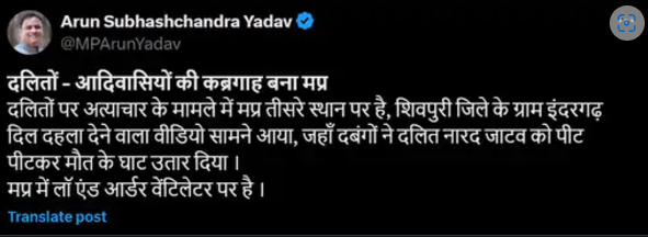 पूर्व केंद्रीय मंत्री और कांग्रेस के नेता अरुण यादव ने भी ट्वीट किया कि मध्य प्रदेश में कानून-व्यवस्था का खात्मा हो चुका है, और राज्य दलितों और आदिवासियों के लिए एक कब्रगाह बन गया है।
