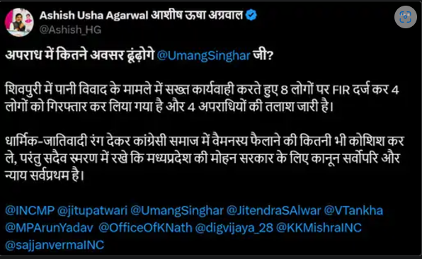 बीजेपी ने कांग्रेस के आरोपों का जवाब देते हुए कहा कि उन्होंने घटना के बाद सख्त कार्रवाई की है और आरोपियों के खिलाफ FIR दर्ज कर चार लोगों को गिरफ्तार किया है। बीजेपी के प्रदेश मीडिया प्रभारी आशीष अग्रवाल ने आरोप लगाया कि कांग्रेस इस मामले को धार्मिक और जातिवादी रंग देने की कोशिश कर रही है, लेकिन राज्य सरकार कानून के शासन और न्याय के पक्ष में खड़ी है।