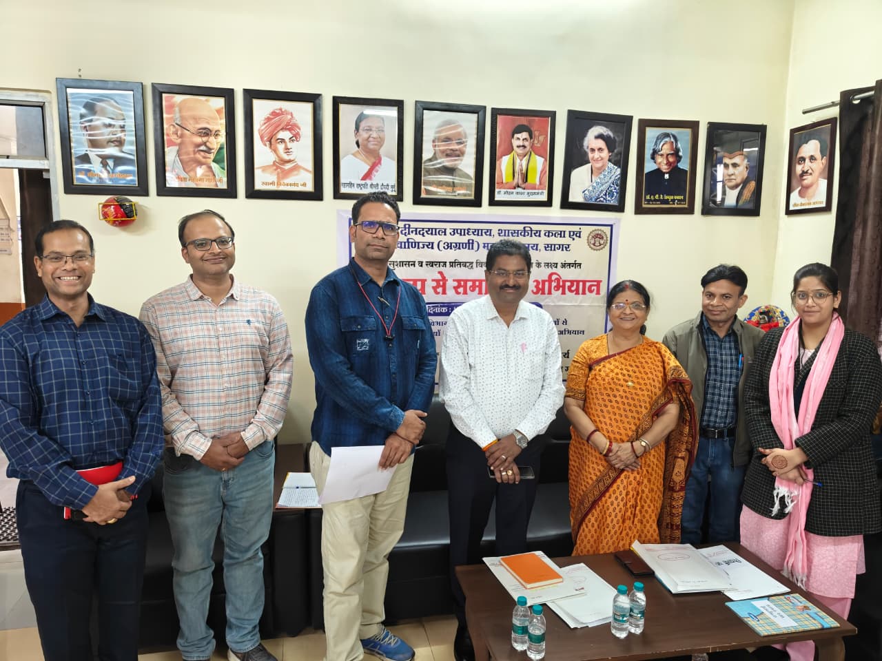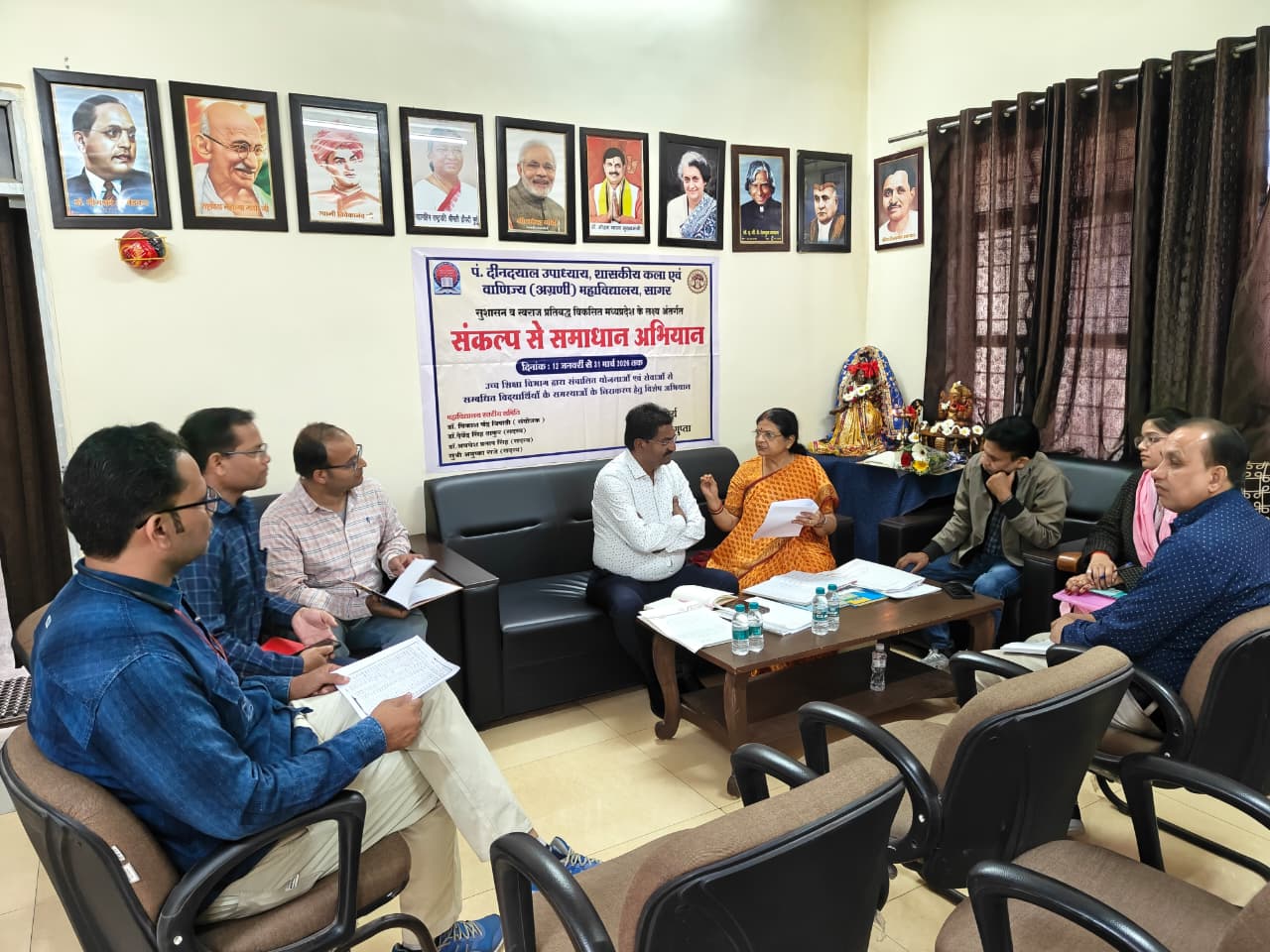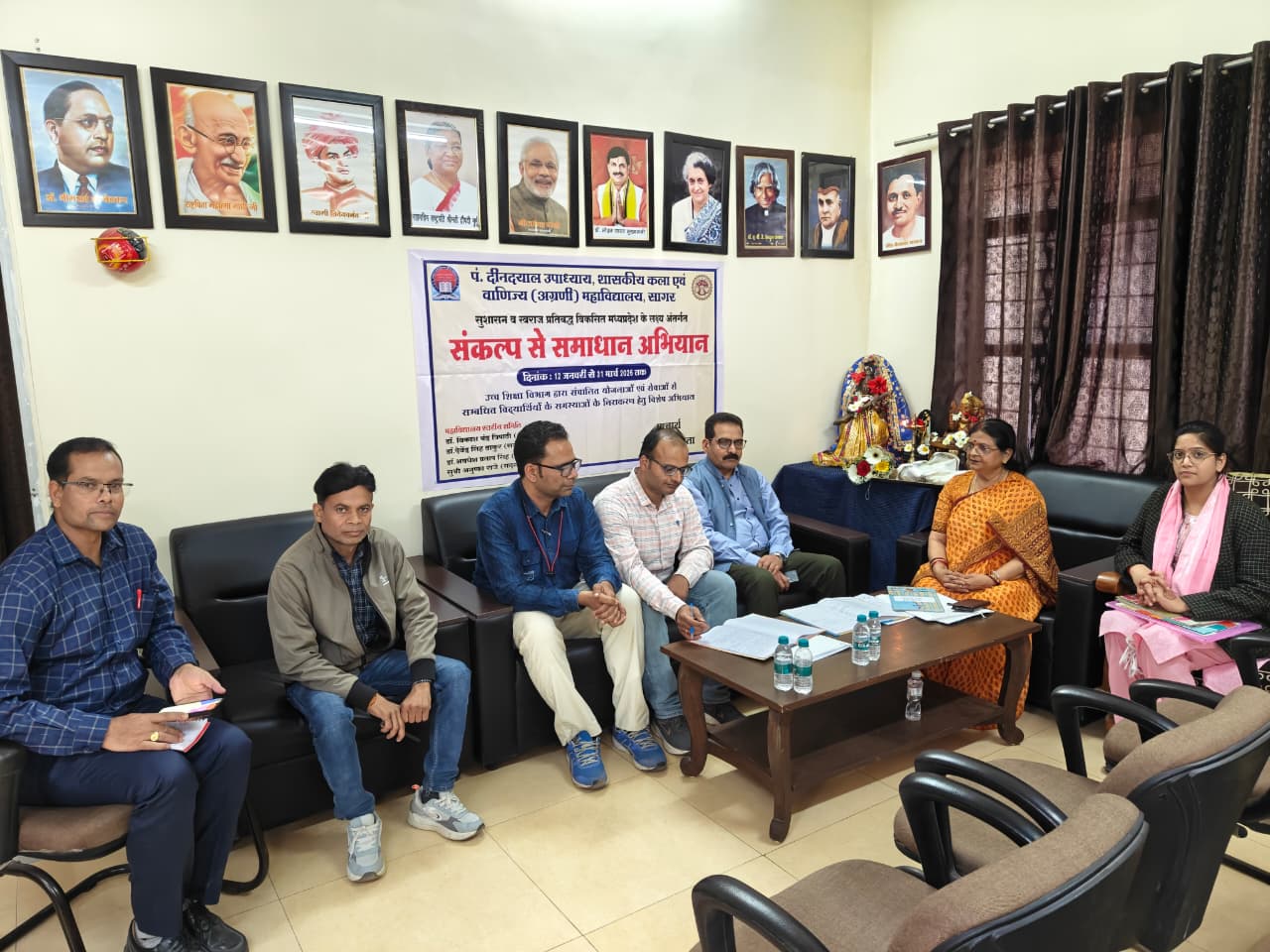 सागर। पंडित दीनदयाल उपाध्याय शासकीय कला एवं वाणिज्य महाविद्यालय में “संकल्प से समाधान अभियान” के अंतर्गत प्राचार्य डॉ. सरोज गुप्ता के मार्गदर्शन में महाविद्यालय स्तरीय बैठक आयोजित की गई। इस अभियान का उद्देश्य विद्यार्थियों की समस्याओं का चरणबद्ध एवं त्वरित निराकरण करना है। महाविद्यालय स्तर पर यह अभियान 12 जनवरी से प्रारंभ होकर 31 मार्च तक संचालित किया जा रहा है।