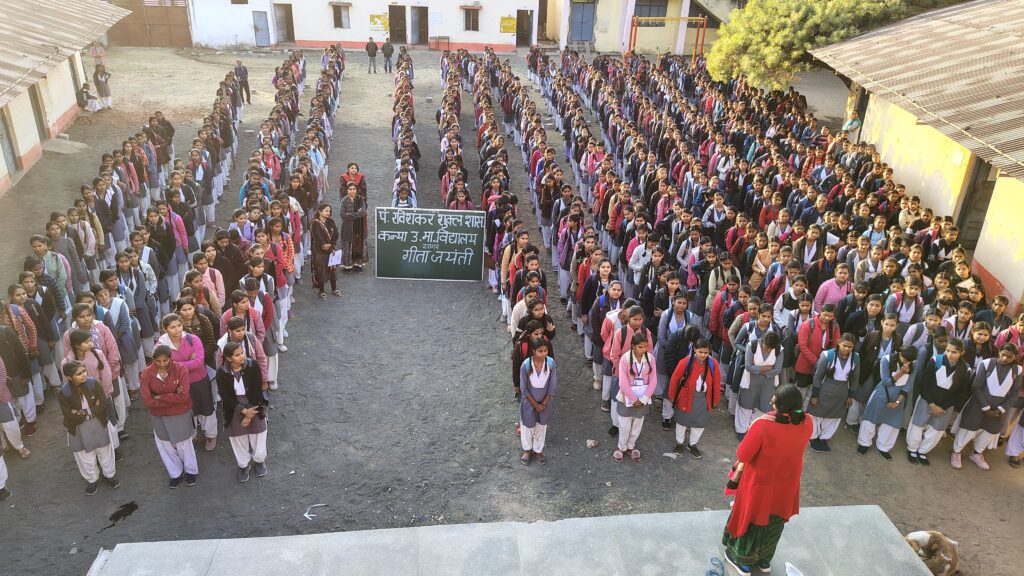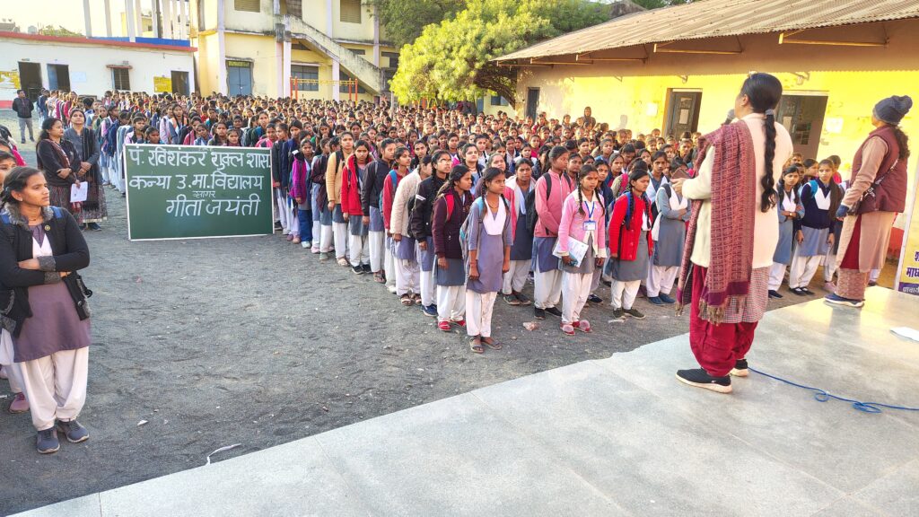 सागर, 11 दिसंबर 2024 – सागर स्थित ई.एफ.ए. पं. रविशंकर शासकीय कन्या उच्चतर माध्यमिक विद्यालय में गीता जयंती का भव्य आयोजन किया गया। इस अवसर पर आयोजित कार्यक्रमों में श्लोक पाठ, निबंध लेखन, भाषण और गीता क्विज जैसी प्रतियोगिताओं में विद्यालय की 321 छात्राओं ने भाग लिया और गीता के महत्व को समझने का अवसर प्राप्त किया।
