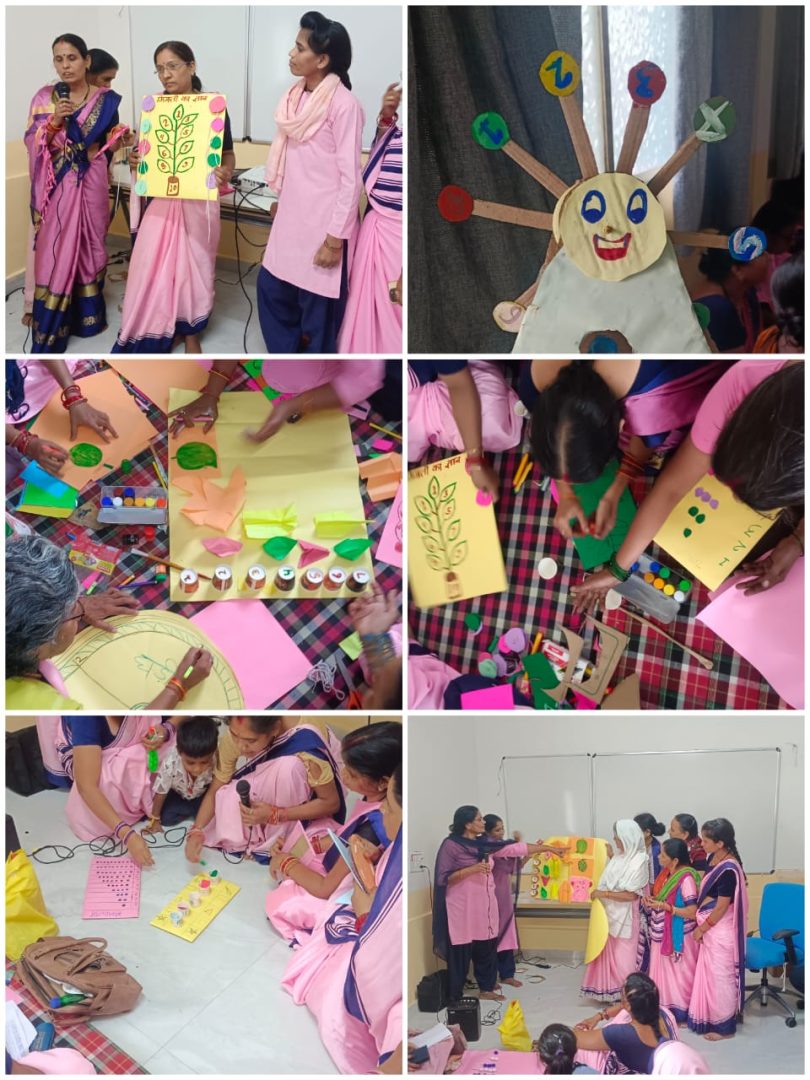 इसके बाद सभी आंगनवाड़ी कार्यकर्ताओं को ग्रुप बनाकर टीएलएम तैयार करने का कार्य दिया गया। प्रतिभागियों ने बोतलों के ढक्कन, गत्ते, पुराने खिलौनों और अन्य घरेलू वस्तुओं से आकर्षक शिक्षण सामग्री तैयार की और उसका प्रेजेंटेशन भी किया।