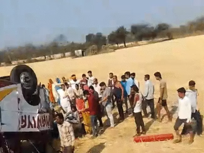 सागर में पलटी बारातियों से भरी बस, 12 घायल:शादी के बाद रायसेन से ललितपुर लौट रहे थे, राहगीरों ने फंसे लोगों को निकाला बाहर !