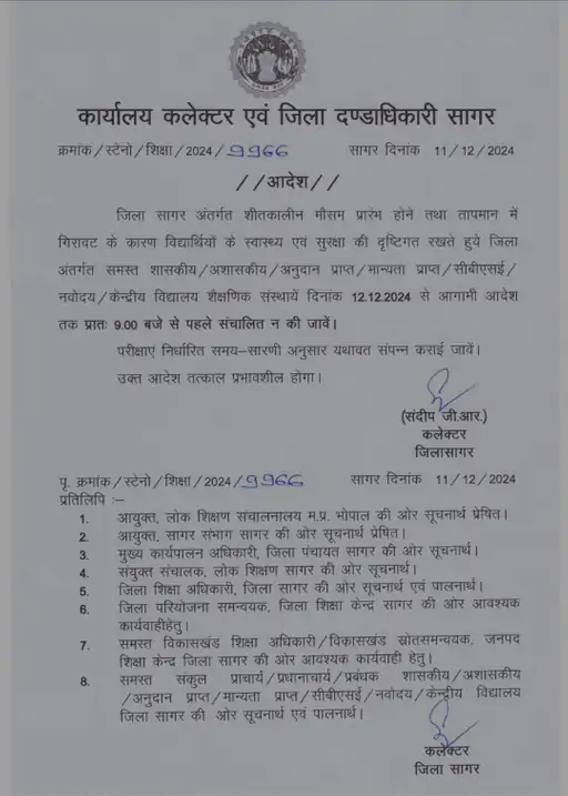 - समय में बदलाव: अब सागर जिले के सभी शासकीय और निजी विद्यालयों का संचालन सुबह 9 बजे से होगा। यह आदेश सभी शासकीय, अशासकीय, अनुदान प्राप्त, मान्यता प्राप्त, सीबीएसई, नवोदय और केंद्रीय विद्यालयों पर लागू होगा।
