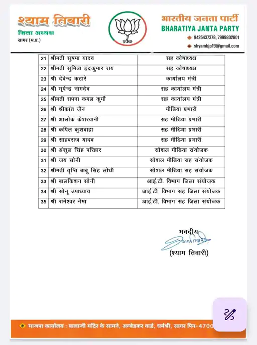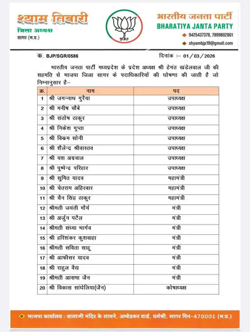 सागर में भारतीय जनता पार्टी ने संगठनात्मक मजबूती की दिशा में एक बड़ा कदम उठाते हुए नई जिला कार्यकारिणी की घोषणा कर दी है। पार्टी के प्रदेश अध्यक्ष हेमंत खंडेलवाल की सहमति के बाद जिला अध्यक्ष श्याम तिवारी ने 35 पदाधिकारियों वाली नई टीम का ऐलान किया। इस घोषणा के साथ ही पार्टी कार्यालय में उत्साह और सक्रियता का माहौल देखने को मिला।