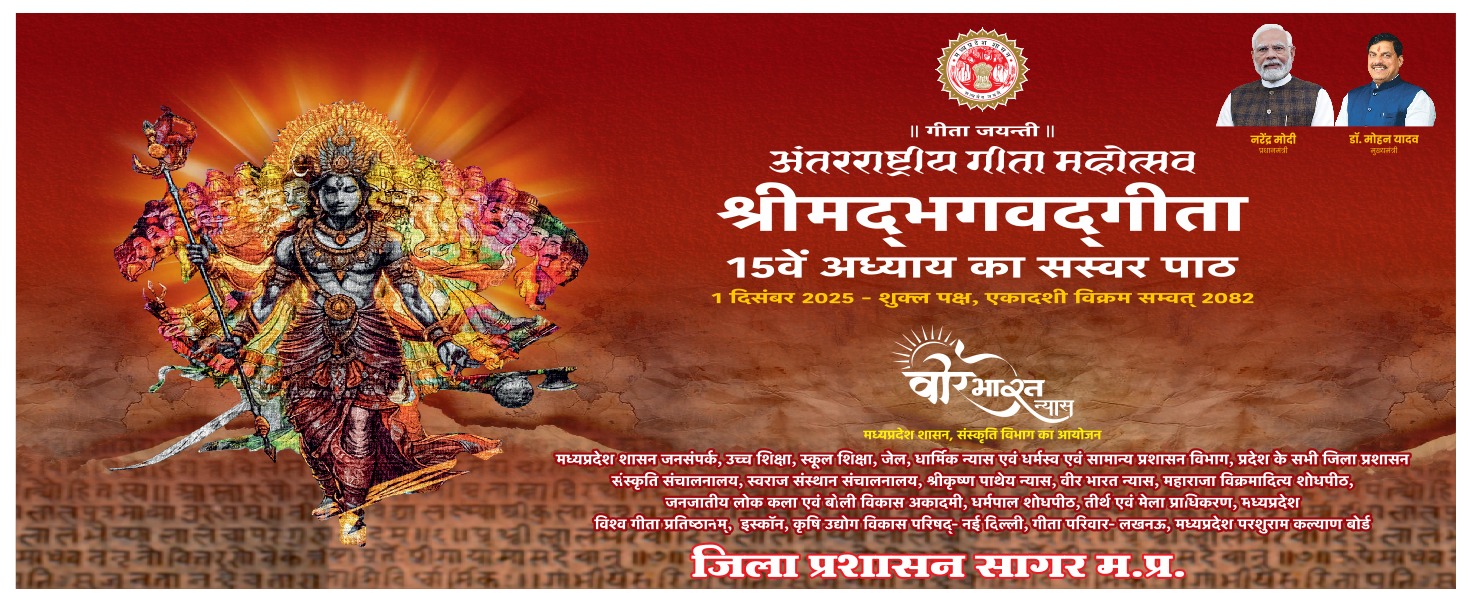 जिले में अंतर्राष्ट्रीय गीता महोत्सव 01 दिसंबर को बड़े पैमाने पर मनाया जाएगा। कलेक्टर श्री संदीप जी. आर. ने सभी विभागों को निर्देश दिए हैं कि कार्यक्रम की समुचित एवं सुव्यवस्थित तैयारियाँ सुनिश्चित की जाएँ। मध्यप्रदेश संस्कृत विभाग, मंत्रालय भोपाल के निर्देशानुसार जिले का मुख्य कार्यक्रम वृंदावन बाग मंदिर परिसर, बस स्टैंड गोपालगंज, गोपाल संस्थान न्यास के समीप प्रातः 10 बजे से प्रारंभ होगा।