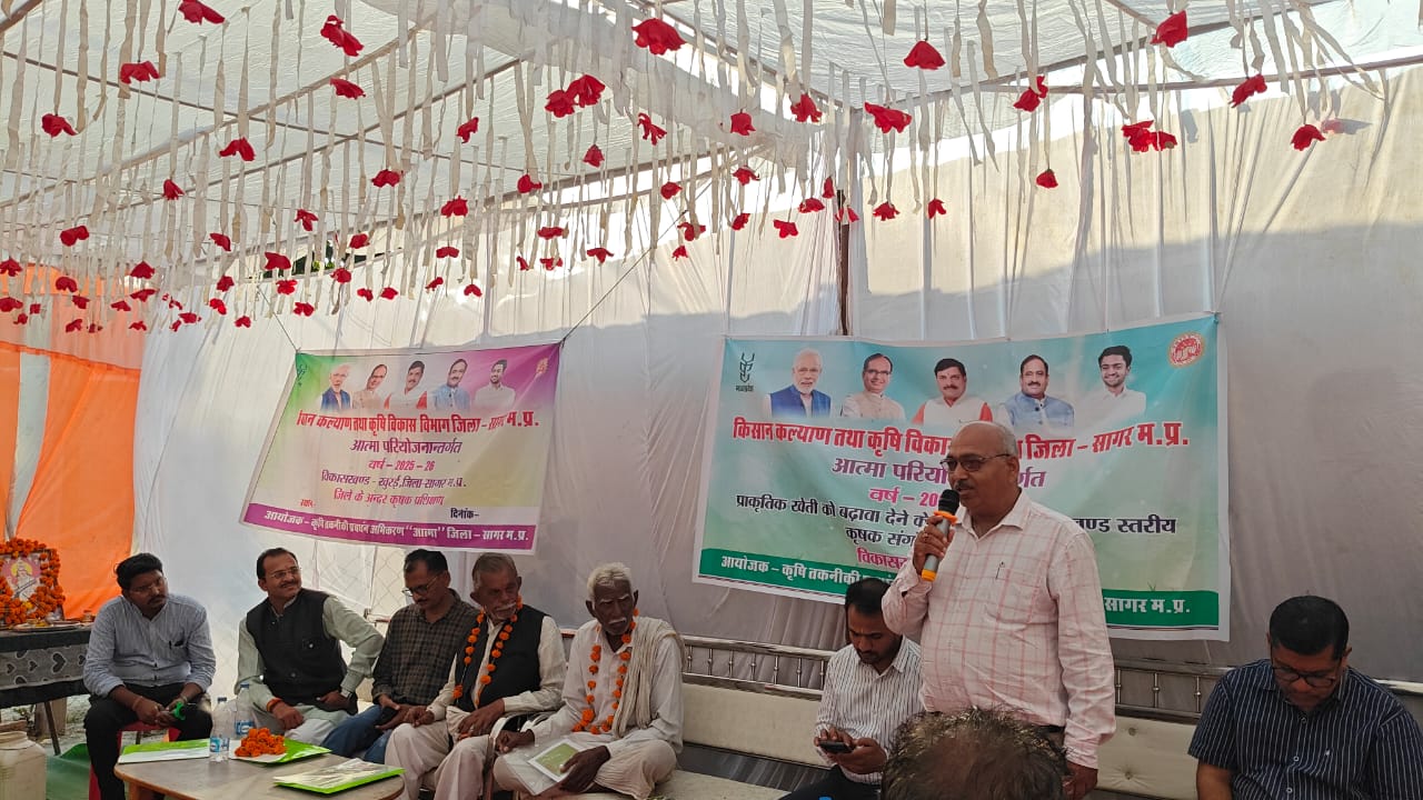 मुकेश कुमार प्रजापति, परियोजना संचालक — आत्मा, सागर ने नेशनल मिशन ऑन नेचुरल फार्मिंग योजना की बिंदुवार जानकारी दी तथा योजना में सम्मिलित कृषकों को मिलने वाले वित्तीय तथा तकनीकी लाभ समझाए। उन्होंने कहा कि योजना का उद्देश्य रासायनिक इनपुट पर निर्भरता घटाकर उत्पादन लागत कम करना और दीर्घकालिक मिट्टी स्वास्थ्य बनाये रखना है।